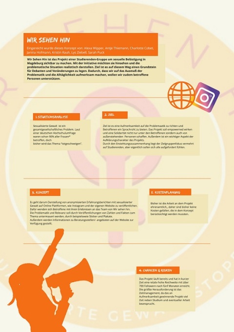"We are looking/Wir sehen hin" is the name of an existing initiative by a student group to make sexual harassment in Magdeburg visible from the perspective of those affected. The goal is to lay the foundation for debate and change. The initiative would like to draw attention to the extent of the everyday nature of sexual harassment and also support those affected. |